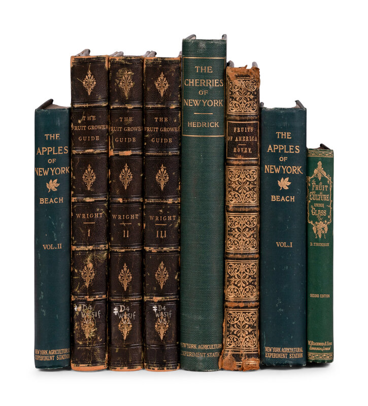 BEACH, Spencer Ambrose (1860-1923). The Apples of New York. Albany: J.B. Lyon Company, 1905. 2 volumes. -- HEDRICK, Ulysses Prentiss (1870-1951). The Plums of New York. Albany: J.B. Lyon Company, 1911. -- HEDRICK. The Cherries of New York. Albany: J.B. Lyon Company, 1915. -- HEDRICK. The Peaches of New York. Albany: J.B. Lyon Company, 1917. -- HOVEY, Charles Mason (1810-1887). The Fruits of America. New York: D. Appleton & Company, 1853. -- THOMSON, David. Handy Book of Fruit Culture Under Glass. Edinburgh and London: William Blackwood & Sons, 1881. -- WRIGHT, John (1836-1916). The Fruit Grower's Guide. London: J.S. Virtue & Co., Limited, [n.d.]. 3 volumes.