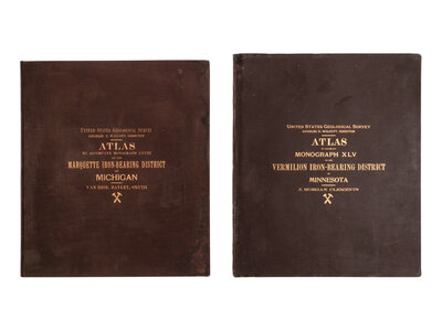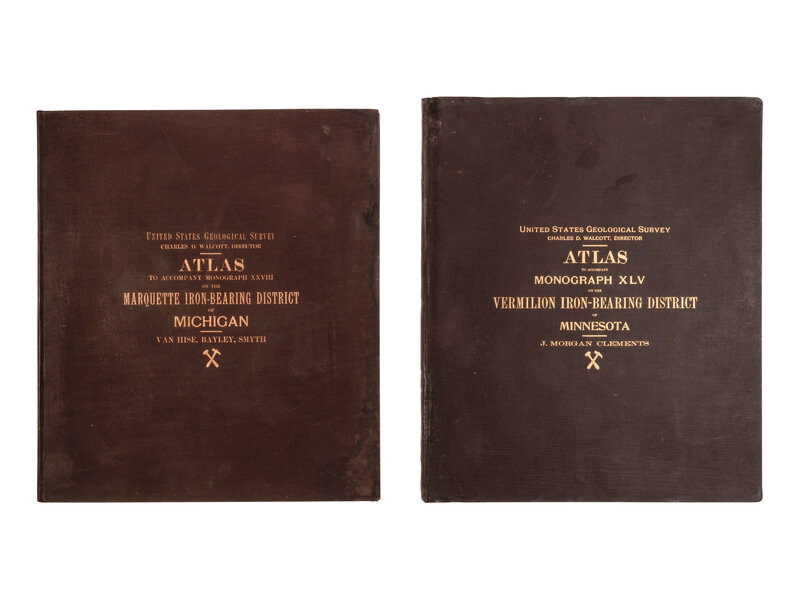 VAN HISE, Richard. Atlas to Accompany Monograph XXVIII on the Marquette Iron-Bearing District of Michigan. Washington, D.C., 1896. 36 maps, most colored. Original gilt-lettered brown cloth. -- CLEMENTE, Julius M. Atlas to Accompany Monograph XLV on the Vermillion iron-bearing District of Minnesota. Washington, 1903. 23 maps, many colored. Original gilt-lettered brown cloth. -- Together, 2 works in 2 volumes, bother folios, BOTH FIRST EDITIONS, condition generally very good.