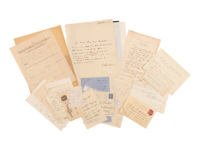 PHILLIPS, William. Autograph letter signed ("William Phillips"), February 1858. 4pp., 8vo, old folds. Describes the events of a man's life through his forty-eighth year based on astrological interpretations. -- CARRINGTON, Richard C. Autograph letter signed ("R.C. Carrington"), to Commander Sands, 7 October 1867. 1p., 8vo, on blue paper, old folds. -- AIRY, George B. Autograph letter signed ("GB Airy"), 6 October 1875. 1p., on Royal Observatory Greenwich letterhead, tipped to album leaf. And approximately 30 others, primarily autograph letters signed, typed letters signed, and clipped signatures, various dates spanning the 19th and 20th centuries, sheets 10 x 8 in. or smaller. Condition varies but is generally good.