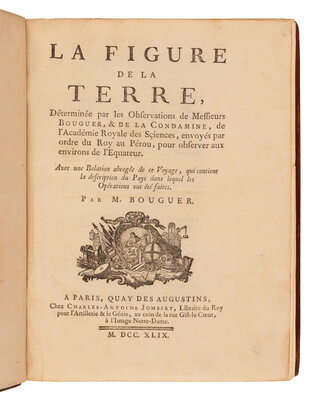 FIRST EDITION of the most important work to issue from the Peruvian expedition of 1735-1744, undertaken by the Academy with the goal of measuring an arc of the meridian near the equator, resulting in the determination of the shape of the earth as an oblate spheroid. Alden & Landis 749/35; Norman 285; Sabin 6876.