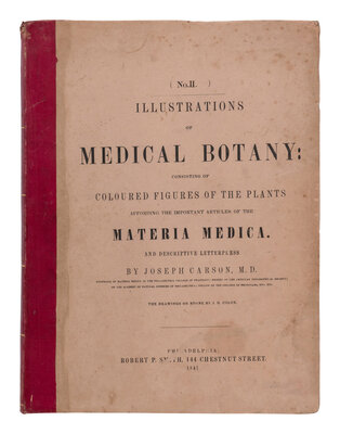 FIRST EDITION OF ONE OF THE RARE ORIGINAL PARTS of Carson's classic work on materia medica, produced in a large format and employing lithographs. McGrath considered them "particularly noteworthy for their technique, carefully heightened with varnish." In format and execution of plates, this ranks as one of the foremost botanical works written and produced in the United States in the 19th century. Carson was a professor of materia medica at the Philadelphia College of Pharmacy (1836-1850) and at the University of Pennsylvania (1850-1876). He also served as editor of the third American edition of Elements of Materia Medica and Therapeutics by Jonathan Pereira. McGrath, p.54. Bennett, p.20.
