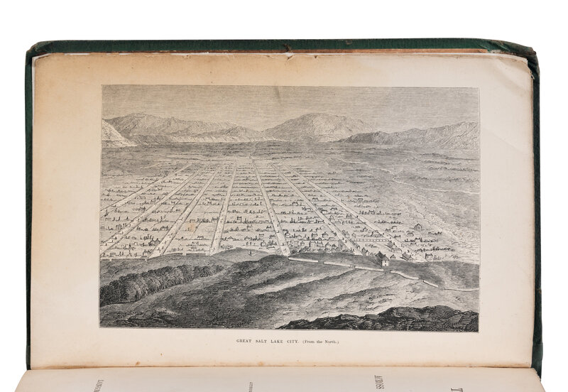 8vo (220 x 137 mm). Half-title; 8 steel-engraved plates, engraved folding map with hand-colored route, engraved folding plan of Salt Lake City, numerous wood-engraved illustrations. (Marginal browning or staining.) Original green cloth, upper cover with gilt medallion, spine gilt lettered, advertisement pastedowns, uncut (spine darkened and ends repaired, fore-corners worn, hinges reinforced, new front and rear flyleaves inserted). Provenance: J. Barnard (early ownership signature).