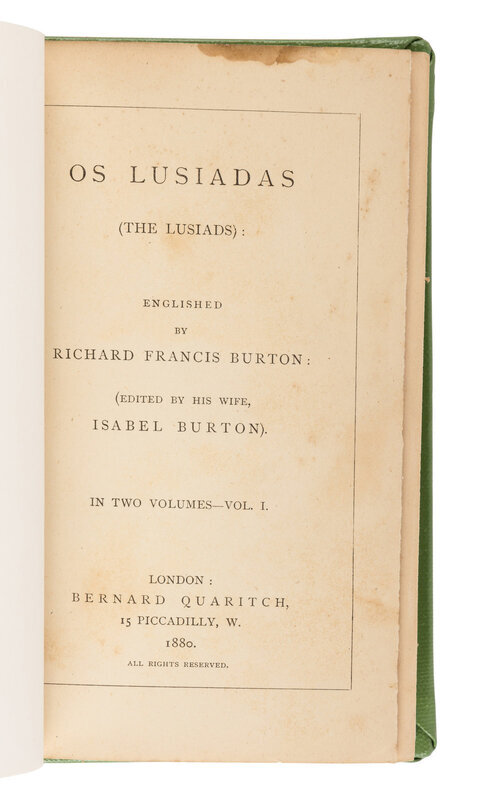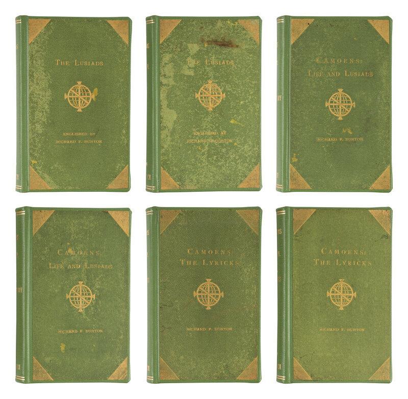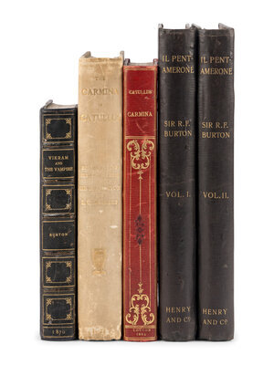 Vikram and the Vampire. L: Longmans, Green, and Co., 1870. 19th-century half black morocco. FIRST EDITION, unknown issue without original cloth. -- Os Lusiadas (The Lusiads). Isabel Burton, editor. 2 vols. -- Camoens: His Life and His Lusiads. A Commentary. 2 vols. -- Camoens. The Lyricks… (Sonnets, Canzons, Odes, and Sextines). 2 vols. L: Bernard Quaritch, 1880, 1881, 1884. Together, 6 volumes. Uniform modern green cloth gilt-lettered, original green cloth gilt mounted to upper covers. FIRST EDITIONS, Os Lusiadas: second issue; Life: FIRST ISSUE; Lyricks: the only issue. -- Priapeia. Cosmopoli: Printed by the Translators, 1890. Later suede-backed boards. LIMITED EDITION, number 401 of 500 copies printed for private subscribers. -- Il Pentamerone. L: Henry and Co., 1893. 2 vols. Original black cloth gilt (rebacked preserving original spines). FIRST EDITION, LIMITED ISSUE, number 88 of 165 copies of the "Large Paper Issue." -- The Carmina of Caius Valerius Catullus. L: printed for the translators, 1894. Original vellum-backed boards. FIRST EDITION, LIMITED ISSUE, one of 1000 unnumbered copies of the "Small-paper Edition." -- And another copy. -- And another copy in early 20th-century half red straight-grained morocco gilt. -- Together, 9 works in 13 volumes, various 8vo and 4to sizes, condition generally good to very good.