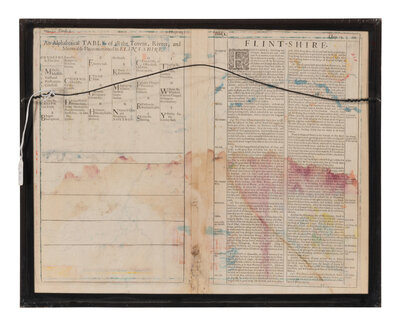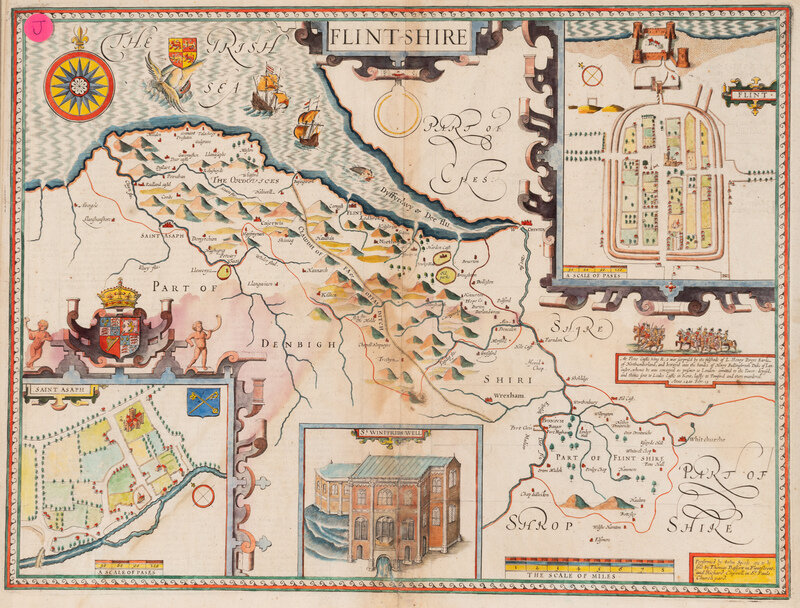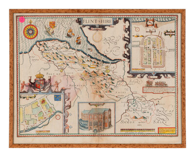 Engraved map with hand-coloring, visible 16 1/2 x 21 inches (419 x 533 mm). Framed, double-glazed (unexamined out of frame). Inset maps of Flint, Saint Asaph, and St. Winfields Well. Adorned with two sailing ships, coat of arms, compass rose, and two sea monsters. Text in English on verso. (Dampstained with some bleed-through.)