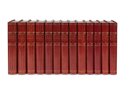 13 volumes, 8vo. Half-titles. (Occasional spotting.) Early 20th century half red morocco gilt, spines in 3 compartments with 2 raised bands, gilt-lettering in one, others with geometric tools gilt, top edges gilt, others uncut, stamp-signed by G.P. Putnam's. Provenance: Armorial bookplates.