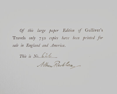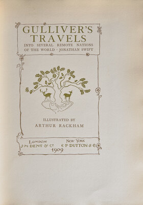 [CHILDREN'S BOOKS] [RACKHAM, Arthur, illustrated]. -- SWIFT, Jonathan. Gulliver's Travels Into Several Remote Nations of the World. London: J.M. Dent & Co./New York: E.P. Dutton & Co., 1909.