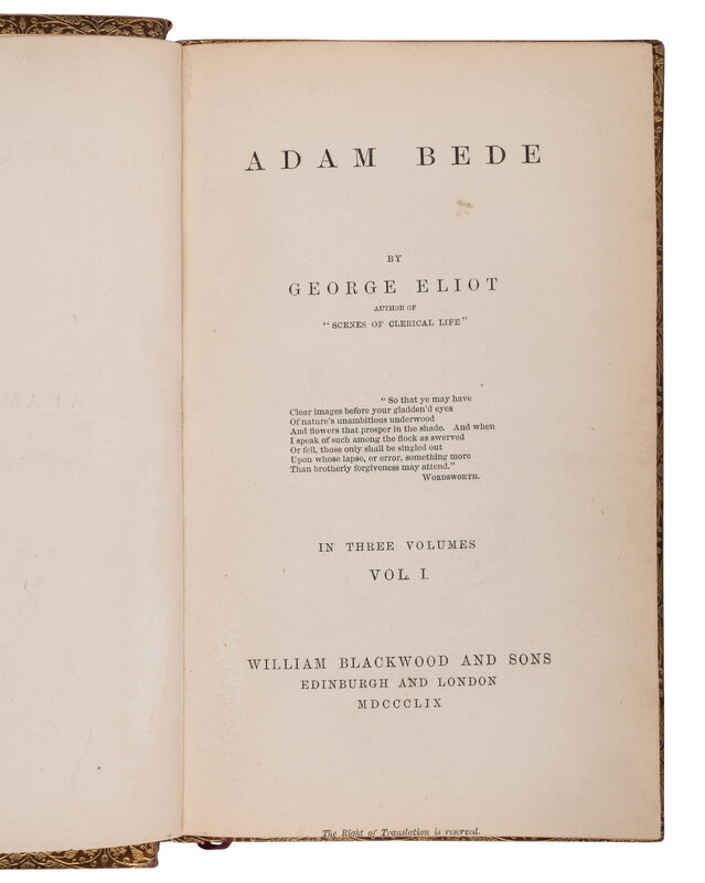 EVANS, Mary Ann ("George Eliot") (1819-1880). Adam Bede. Edinburgh and London: William Blackwood and Sons, 1859.