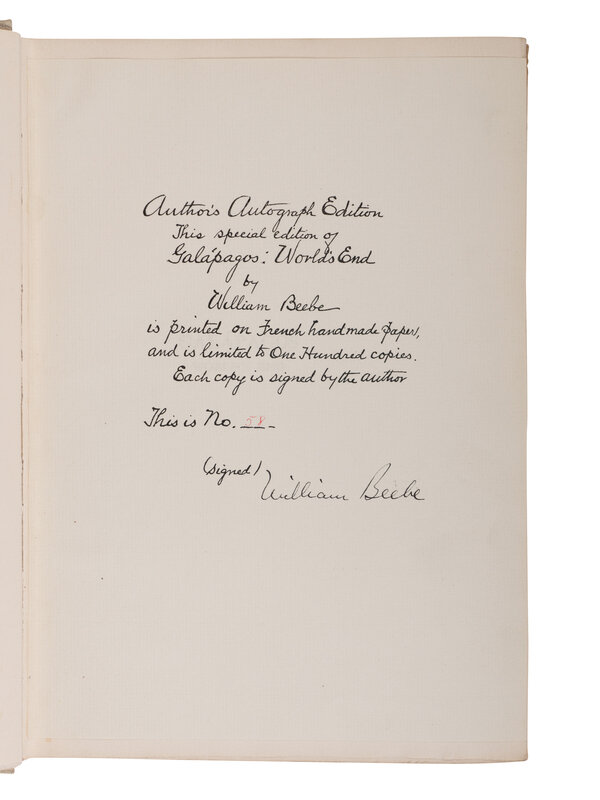 LIMITED EDITION, number 58 of 100 copies on handmade paper of the "Author's Autograph Edition," SIGNED BY BEEBE. In 1923, Beebe sailed as a naturalist on the Harrison Williams Galapagos Expedition aboard the 'Noma.' Their route took the party from New York to Florida, Cuba, through the Panama Canal to the Galapagos, with the purpose of collecting and studying rare species of animal and marine life.