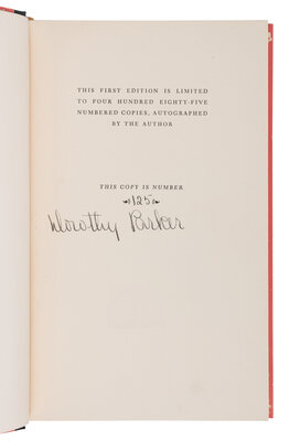 FIRST EDITION, LIMITED ISSUE, number 125 of 485 copies, SIGNED BY PARKER. Dorothy Parker was renowned as one of the great poets of the early twentieth century, with her first volume of poetry, Enough Rope (1926) hailed as being "caked with salty humor...and tarred with a bright black authenticity." Later in life she worked as a screenwriter in Hollywood; during this time she received two Academy Award nominations with her first being for her 1937 screenplay for A Star is Born.