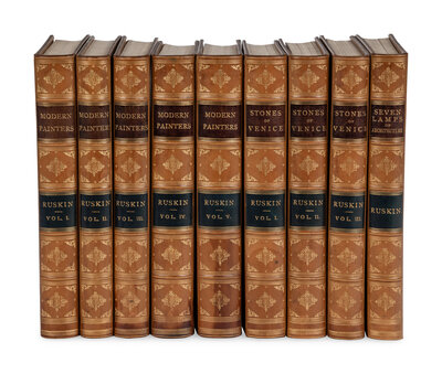 "Taken in the mass, [Modern Painters, Seven Lamps of Architecture, and Stones of Venice] contain the most valuable contributions to art-literature the language can show... they contain worlds of thought, imagination, and knowledge such as no other art-writer can reduce... It is impossible but that Art should be the better for them" (Allibone, 1895). In the Preface to Modern Painters, it is stated that this edition contains extra plates not found in the 1843 first edition. A TALL AND BRIGHT SET.