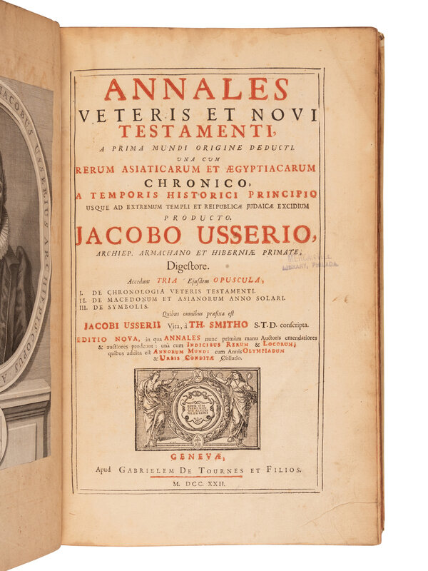 USSHER, James (1581-1656). Annales Veteris at Novi Testamenti, a Prima Mundi Origine Deducti. Una cum Rerum Asiaticarum et Aegyptiacrum Chronicoa Temporis Hostorici Principio. Geneva: Gabriel de Tournes et fils, 1722.