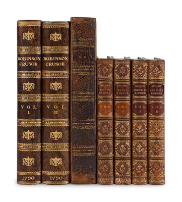 1) DEFOE, Daniel. The Life and Strange Surprizing Adventures of Robinson Crusoe of York, Mariner. London: Printed for John Stockdale, 1790. 2 volumes. Later full mottled calf gilt.