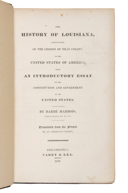 FIRST EDITION IN ENGLISH, translated from the first edition of 1829 in French. "Barbé-Marbois represented France in the preliminary negotiations with the United States on the Louisiana Purchase and his book is one of the main sources on that subject. It shows that in the claim by the United States in the negotiations with Great Britain, that the northern boundary of Louisiana included the area now comprised in Oregon, Washington and Idaho was without foundation" (Streeter). Howes B-115 (first edition); Sabin 3307; Streeter Sale III: 1600.