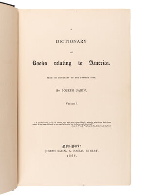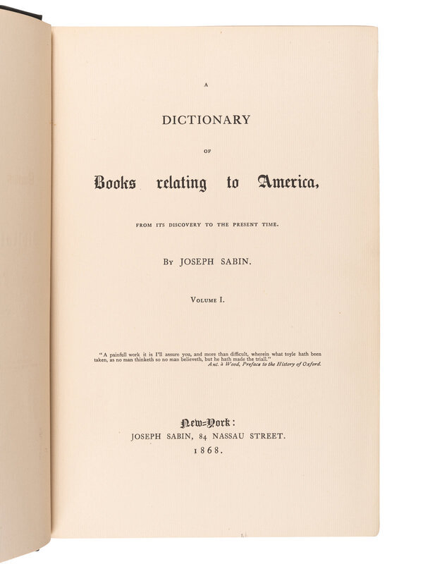 [AMERICANA - BIBLIOGRAPHY]. SABIN, Joseph (1821-1881). A Dictionary of Books Relating to America. R.W.G VAIL, editor. New York: Joseph Sabin, 1868-1936.