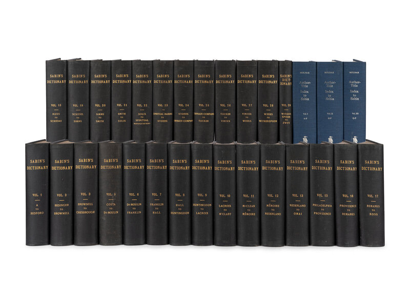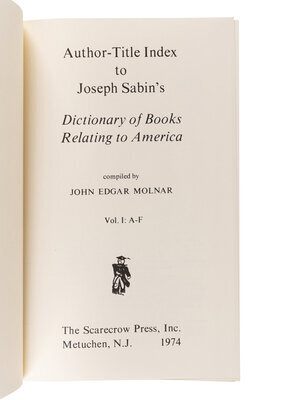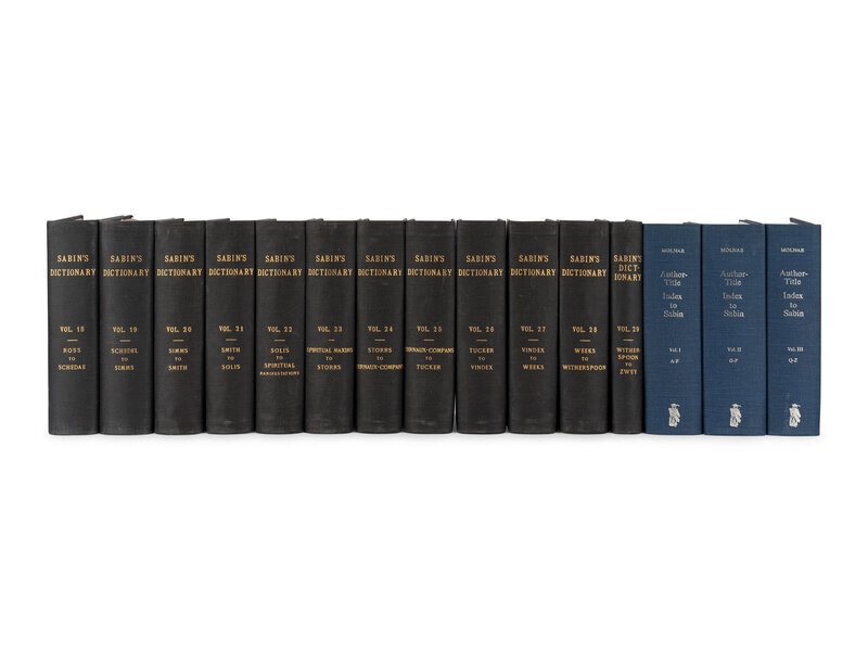 [With:] MOLNAR, Joseph Edgar. Author-Title Index to Joseph Sabin’s Dictionary of Books Relating to America. Metuchen, NJ: The Scarecrow Press, Inc., 1974. 3 volumes, 8vo. Original blue cloth stamped in silver. FIRST EDITION.
