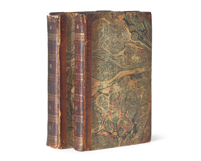 Third Edition. In two volumes. 8vo. xix, (i), 427; viii, 376 pp. Illustrated with 16 engraved plates of views and maps (including large folding map with hand-colored outlining). Contemporary three-quarter brown calf over marbled paper-covered boards, calf dry and chipping, front and rear boards on each volume starting, head of spine on first volume perished, boards toned and rubbed, corners worn; all edges trimmed; book-plate of Zachary T. Hollingsworth on front paste-down of each volume; scattered spotting to text. Clark, Old South II:132-2; Howes W-235; Sabin 102541