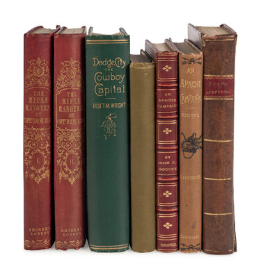 4) BOURKE, John G. An Apache Campaign in the Sierra Madre. New York: Charles Scribner's Sons, 1886. PRESENTATION COPY, with a printed slip tipped in ("Compliments of the Author") and in a presentation morocco binding gilt-lettered with the above words to C.A. Snow. Howes B-652.