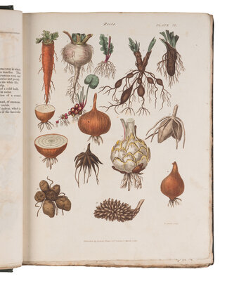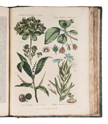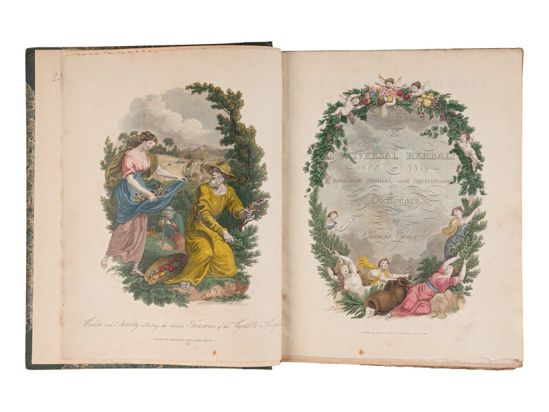 The Universal Herbal was compiled by Thomas Green from various sources for use "whether as food, as medicine, or in the arts and manufactures— adapted for the use of the farmer, the gardener, the husband-man, the botanist, the florist, and country house-keepers." Many of the plates were painted from life by renowned botanical artists Georg Dionysius Ehret and Maria Sybilla Merian while others were copied from earlier works and were then engraved by printers Dixon, Dobie, Swift, and others. Nissen BBI 1882; Sitwell, Great Flower Books, p. 58.