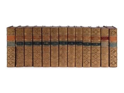 14 volumes in 15, 8vo. Engraved portrait frontispiece in vol.1, 104 folding engraved plates. Contemporary half calf, spines in 6 compartments with 5 raised bands, morocco lettering-pieces gilt in 2, edges stained red (some splitting to a few joints, boards rubbed). Provenance: notations in a contemporary hand on vol.1 front free endpaper; old ink library stamps of Wolfenbuttel Gymnasium on front free endpapers.