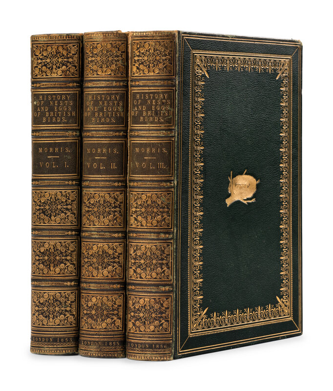 3 volumes, 8vo. 223 hand-color plates; publisher's notice tipped-in to contents leaf in vol.1. (Some spotting to preliminaries.) Original deluxe olive morocco gilt, central device on covers depicting a nest with eggs, spines in 6 compartments with 5 raised bands, gilt-lettering in 2, others extra gilt, all edges gilt, stamp-signed by Hayday (light rubbing to extremities, rear joint splitting on vol.3, spines evenly toned). Provenance: Charles Smith Hannington (bookplate); Dennis F. Ward (bookplate).