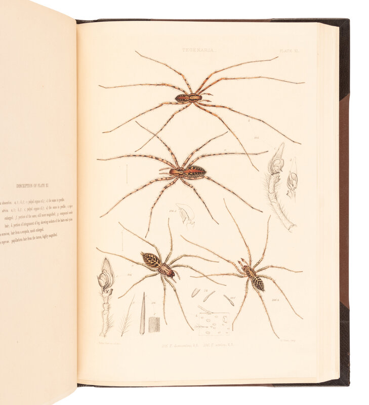 FIRST EDITION. "Since the publication of Dr. Lister's treatise [Tractatus de Araneis] in 1678, little attention has been bestowed upon the natural history of spiders in this country, till within the last thirty years...under these circumstances, it is hoped that the present imperfect endeavour...will be regarded with due consideration for the numerous and great difficulties by which the undertaking is surrounded" (Preface, p.[1]).