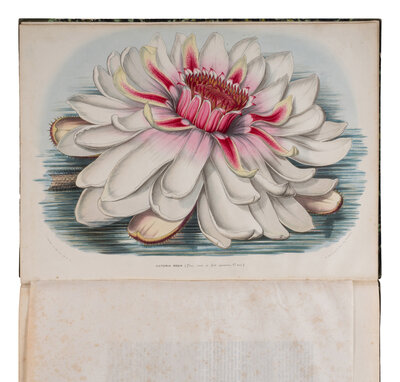 A VERY RARE LARGE-PAPER OFFPRINT WITH THE PLATES UNFOLDED, FROM THE Flore des Serres et des Jardin de l'Europe, recording the flowering of the Victoria regia in Belgium in a specially constructed heated glass-house in the extensive gardens of van Houtte. The plant was grown from seed at Chatsworth in February 1850, and arrived in Ghent on 26 May 1850, growing vigorously through until the late autumn, with the first flower blooming on 5th September 1850: probably the first time the plant flowered on the mainland of Europe. Pritzel 7167; Stafleu & Cowan 8009.