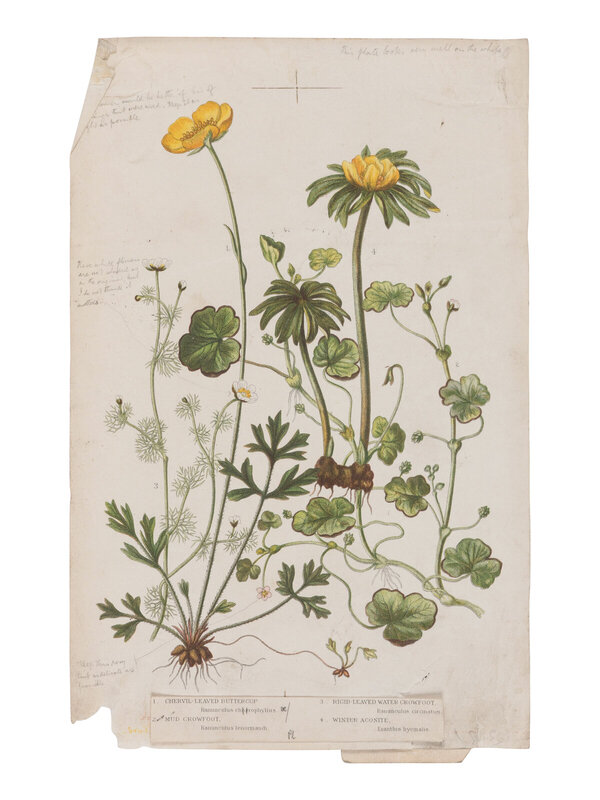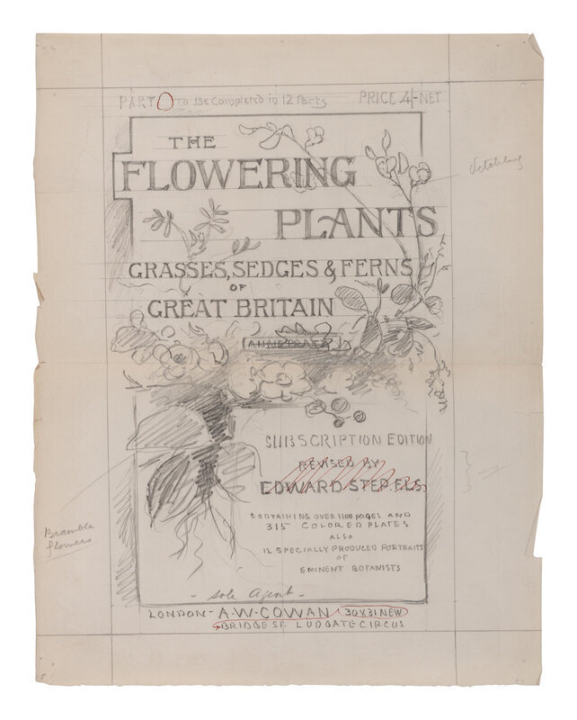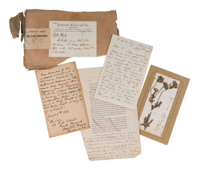 PUBLISHER'S COPY, WITH AUTOGRAPH REVISIONS AND EMENDATIONS BY ANNE PRATT, EDWARD STEP, AND BOTANIST JAMES BRITTEN for the "Subscription Edition" of this work in parts published by A.W. Cowan and soon thereafter bound-up in 4-volumes by Warne. Frederick Warne sent this copy to the three botanists for their inclusion of edits for the updated publication, which would eventually be returned to the publisher with copious notes and correspondence. The archive of material included comprises: numerous plates with extensive manuscript notations by Step, autograph letters from both Pratt and Britten to the publisher explaining the corrections, a specimen sample used for the original 1882 publication, several mock-ups of the new publication's cover design for the parts, and Pratt's 48pp. manuscript notebook with her notes for each of the plates.