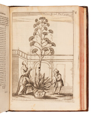 3 parts in 2 volumes, small 4to. Engraved portrait frontispiece, 30 engraved plates (most double-page and folding). (Dampstained throughout, mainly in first volume.) Contemporary calf, single gilt rule frame, spines in 6 compartments with 5 raised bands, gilt-lettering in second, others gilt, red speckled edges (spine ends repaired, first volume rebacked preserving original spine). Provenance: Phillip Carteret Webb (1702-1777), English barrister (armorial bookplate); Henry and Carol Faust (bookplate).