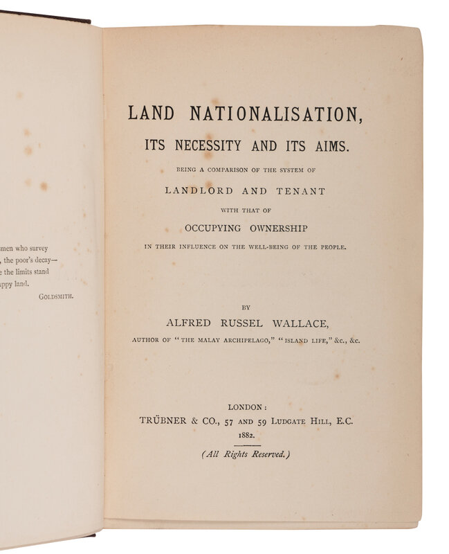 [NATURAL HISTORY]. WALLACE, Alfred Russel (1823-1913). Land Nationalisation, Its Necessity and Its Aims. London: Trubner & Co., 1882.