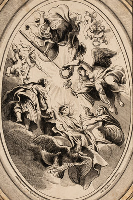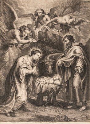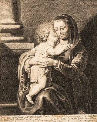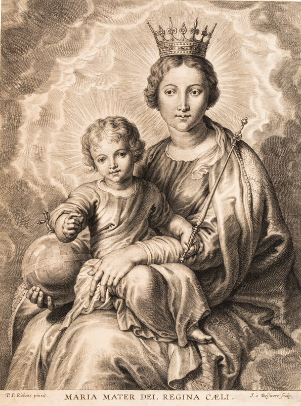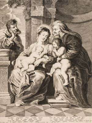 A group of five works: Virgo quem genuit and Adoravit by Schelte A. Bolswert (Dutch, 1586-1659), Madonna and Child by Jonah Svyderhoef (Dutch, 1613-1686), Apotheosis of James I by Lucas Vorsterman (Flemish, 1595-1675), and Holy Family by Jan Witdoeck (Flemish, c. 1615-1642)
