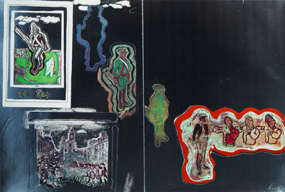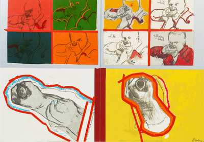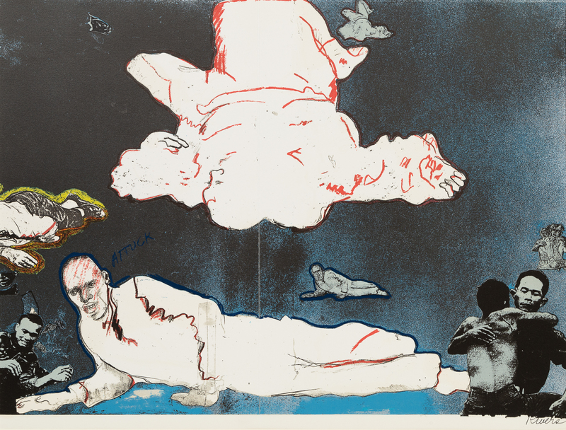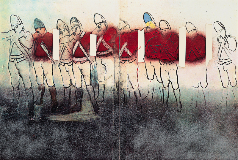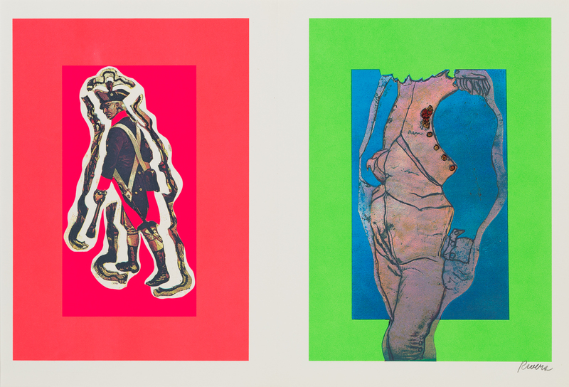 A group of 13 works from The Boston Massacre portfolio, 1970, including: Portfolio Cover, Untitled (Green), Meanwhile in Europe, Soldiers, 40th Regiment, Kneeling Soldiers, Soldiers Aiming Guns, Wounded Soldiers, For Crispus, Man Aiming Gun, Ease, Some (Visual) Afterthoughts, and Soldier