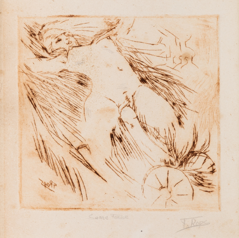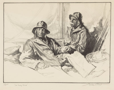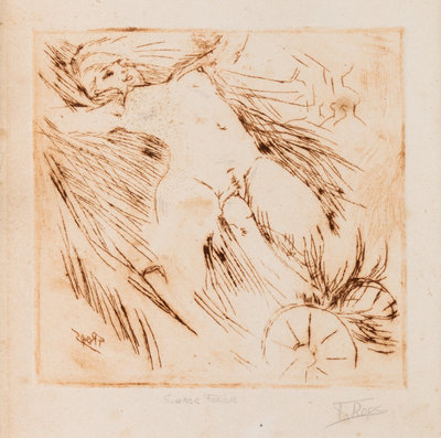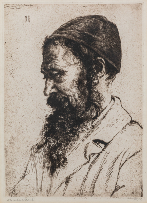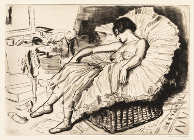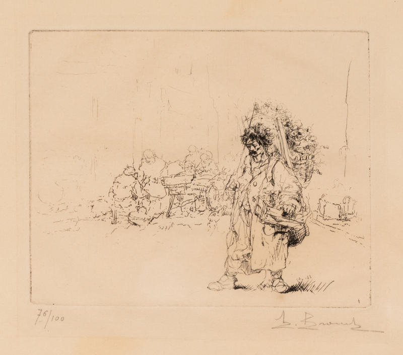 including Flower Seller with Basket by Auguste Brouet (French, 1872-1941), The Hardy Breed by Gordon Grant (American, 1875-1962), Sleeping Dancer by Laura Knight (English, 1877-1970), Serre-fesses by Flicien Rops (Belgian, 1833-1898) and Gentleman with Skull Cap and Beard by Hermann Struck (German, 1876-1944)