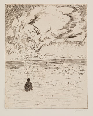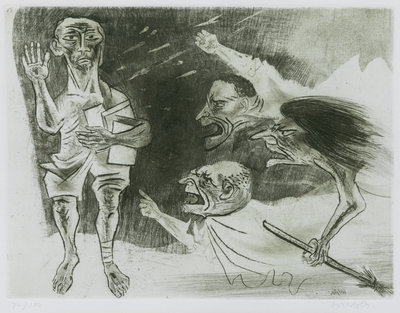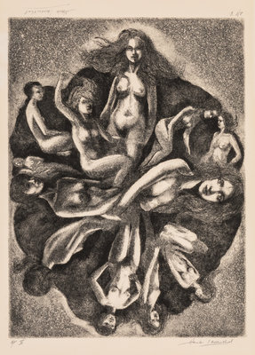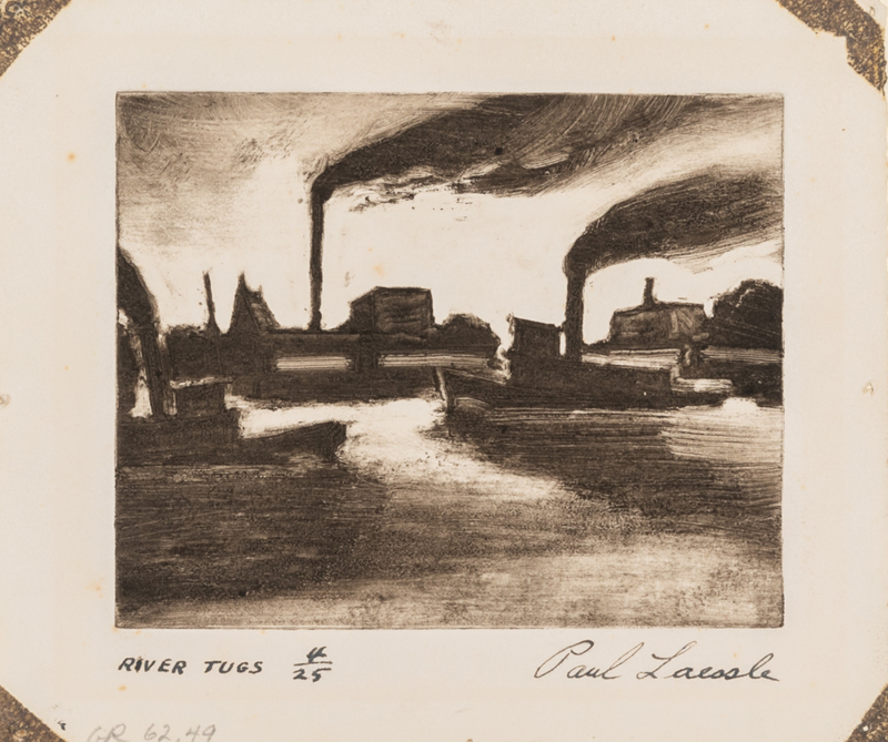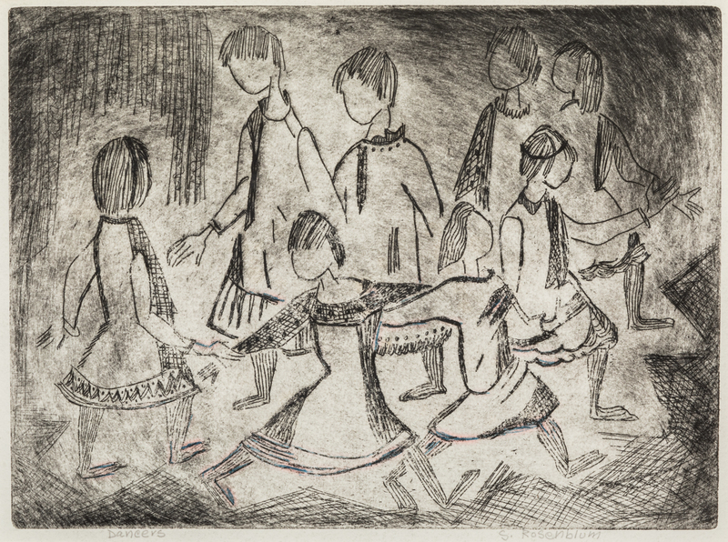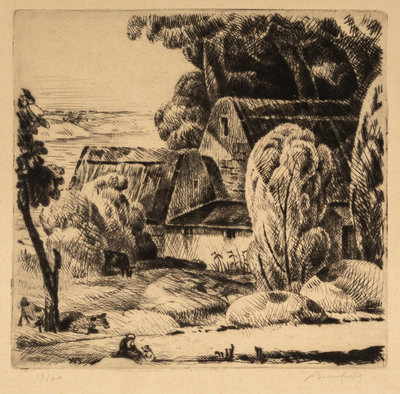 including Cottage by the Stream by Adolphe Beaufrre (French, 1876-1960), The Tumble by Edmund Blampied (English, 1886-1966), Man, Woman, and Child by George Constant (Greek-American, 1892-1978), Untitled by Albert Goldman (American, 1922-2011), Tomorrow's Saint by William Gropper (American, 1897-1977), Mexican Farm by Herry Hering (American, 1887-1967), River Tugs by Paul Laessle (American, 1908-1988), Untitled by Hank Laventhol (American, 1927-2001), and Dancers by Sadie Rosenblum (Russian-American, 1899-1987)