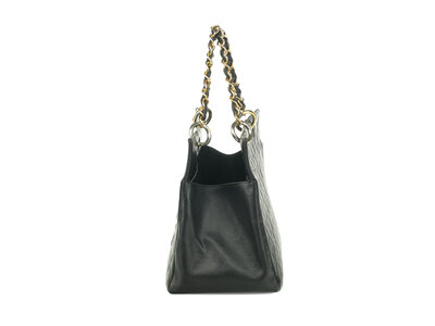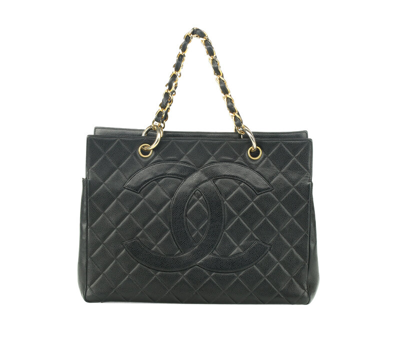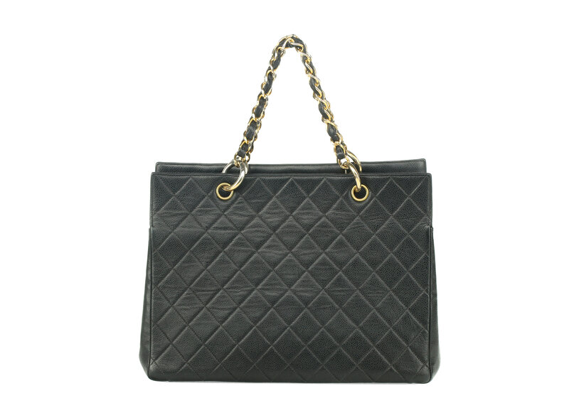 Chanel Grand Timeless Shopping Tote in Quilted Black Caviar Leather with Gold-Tone Hardware. Interwoven Leather-Metal Chain Straps.