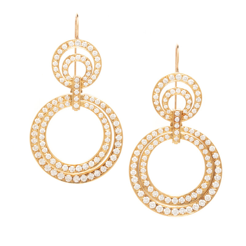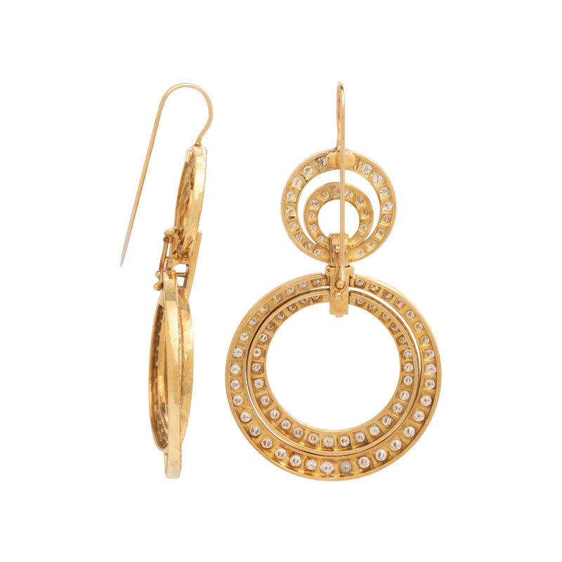 Round diamonds weighing approximately 6.50 - 7.00 carats total, both lower hoops are detachable. Yellow gold. 1 1/2 inches long or 2 3/4 inches long with extra hoops.