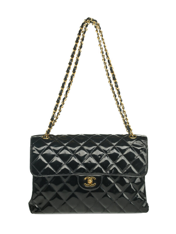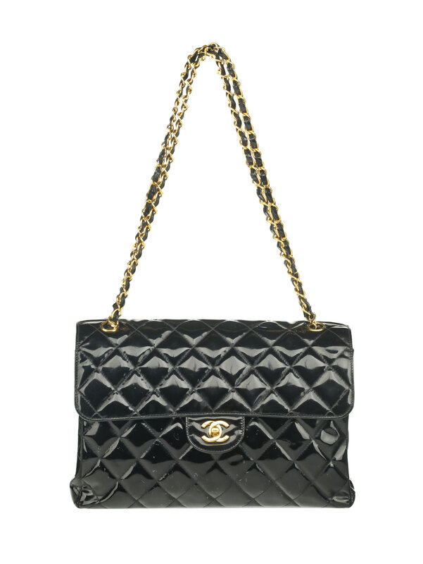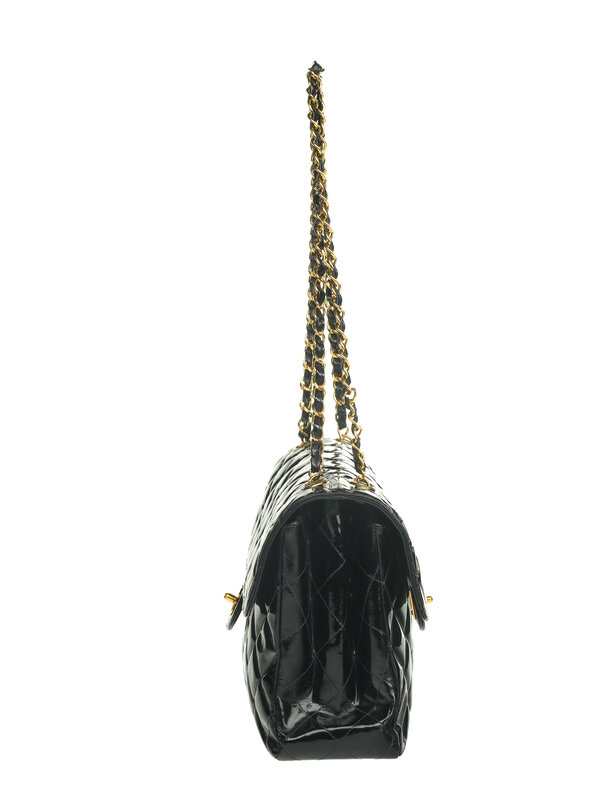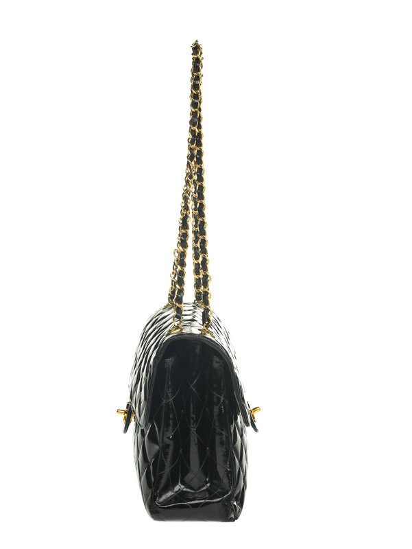 Chanel Double-Sided Classic Flap Bag in Quilted Black Patent Leather with 24k Gold-Plated Hardware. CC Turn-Lock Closures and Interwoven Leather-Metal Chain.
