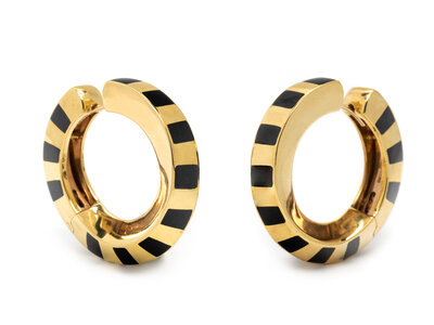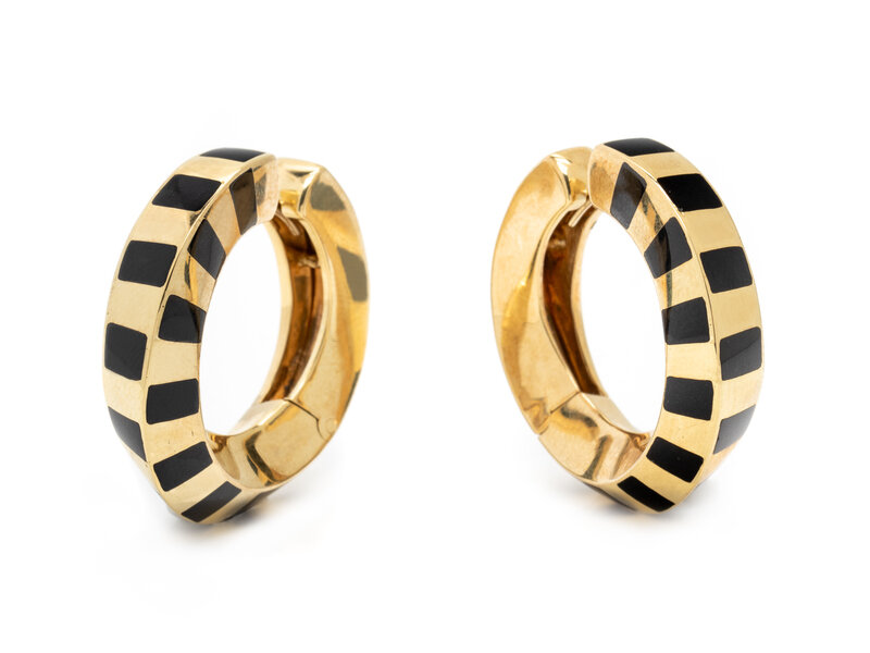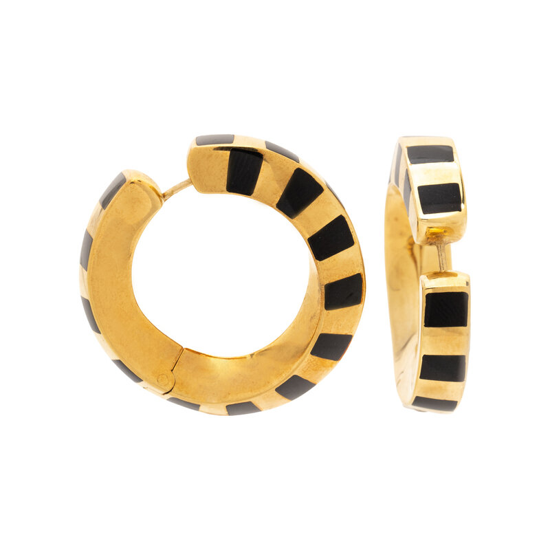 TIFFANY & CO., YELLOW GOLD AND ONYX HOOP EARRINGS