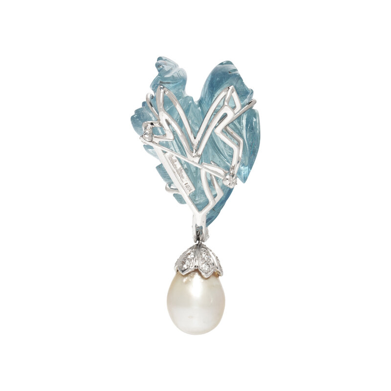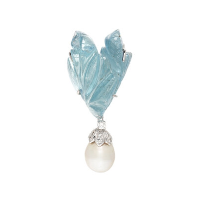 Carved aquamarine measuring approximately 40.50 x 29.75 x 17.15 mm, cultured pearl measuring approximately 15.65 x 14.00 mm, and round diamonds weighing approximately 1.00 carat total. 18 karat white gold. 2 1/2 x 1 1/4 inches.