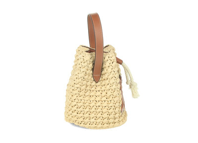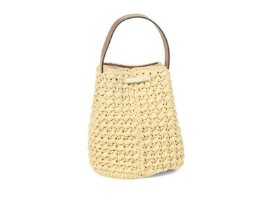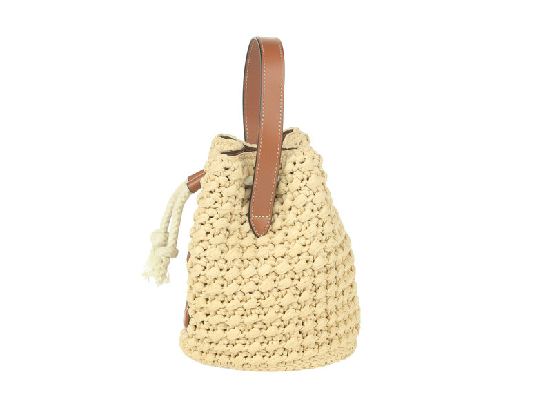 Teen Drawstring Bucket Bag in Crocheted Beige Raffia and Light Brown Calfskin Leather with White Braided Cord Drawstring.