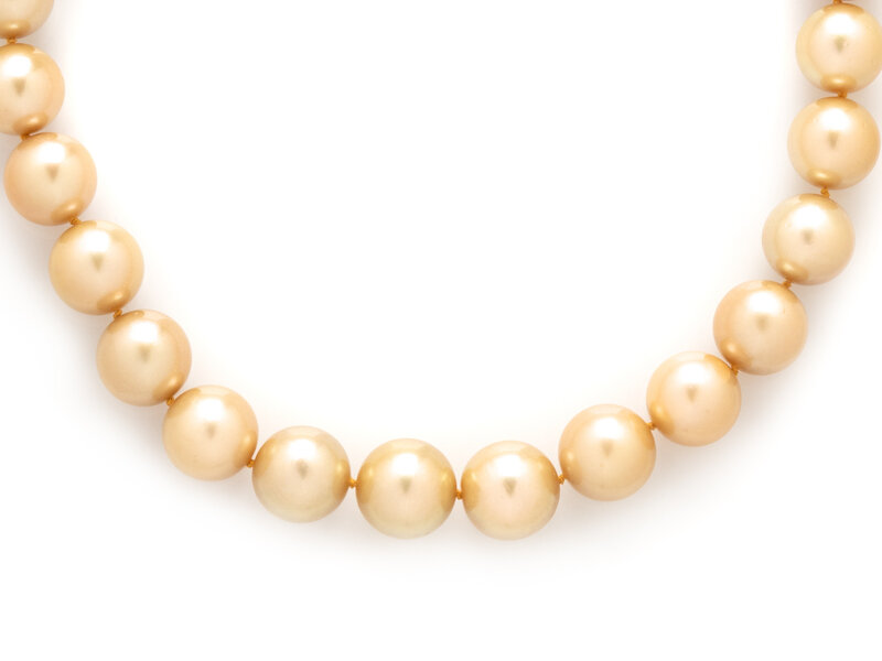 Graduating golden cultured pearls (origin of color not tested) measuring approximately 15.00 - 16.95 mm, with an 18 karat yellow gold round diamond clasp. 19 1/4 inches long.