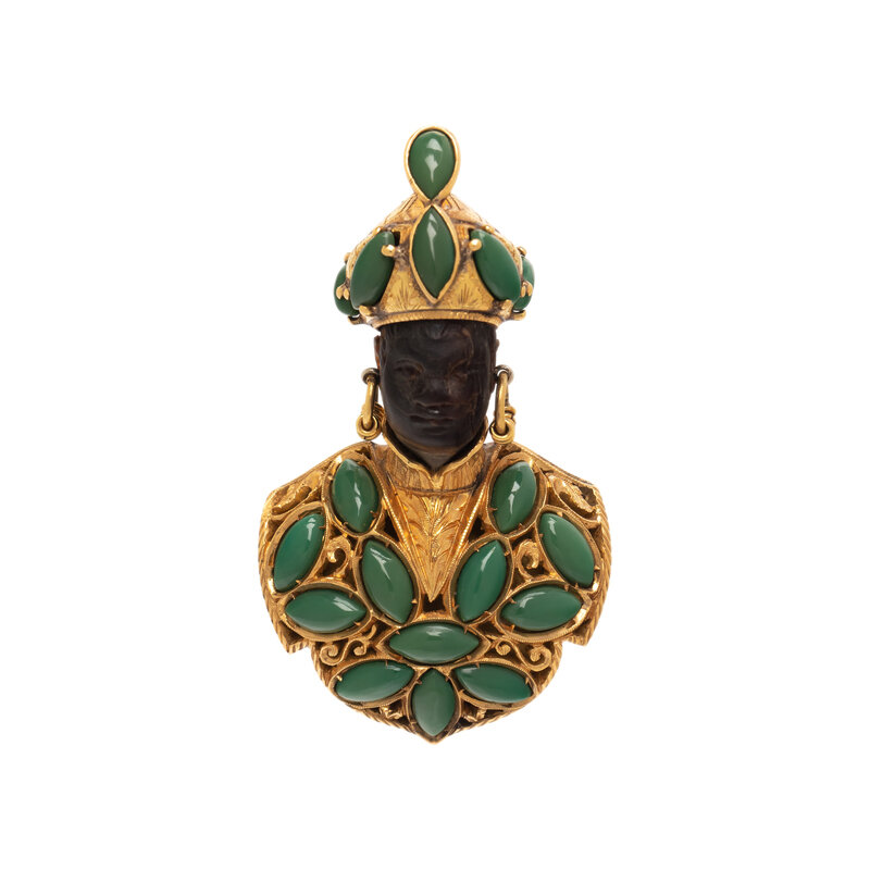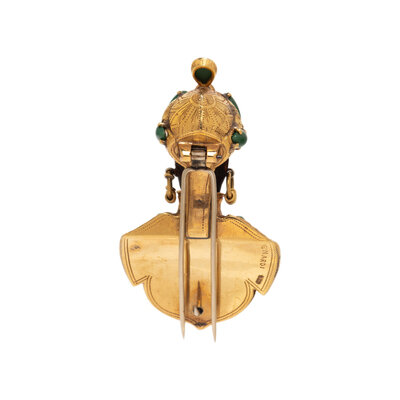 Carved figure with yellow gold mounts set with marquise and pear shape cabochon jade. 2 1/4 x 1 1/4 inches.