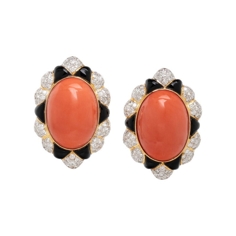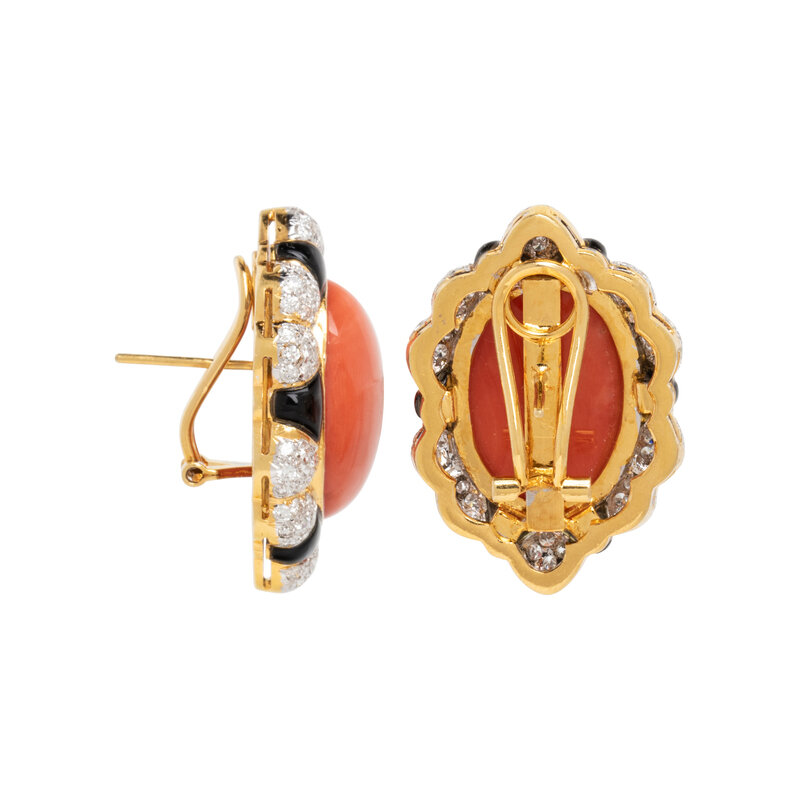 Oval cabochon coral measuring approximately 21.55 x 15.50 x 8.50 mm, black enamel, and round diamonds weighing approximately 1.95 carats total. 18 karat yellow and white gold. 1 3/8 inches long.