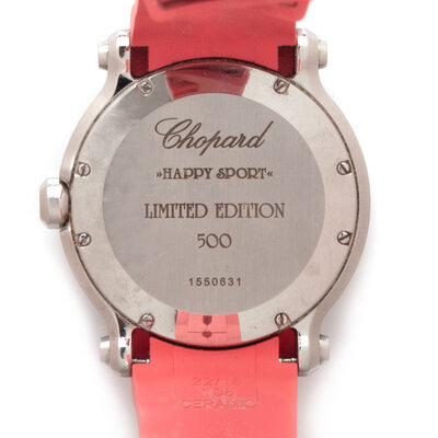 Stamps: Case back: Chopard HAPPY SPORT LIMITED EDITION 500 1550631. Clasp: Chopard SWISS ACIER INOX.