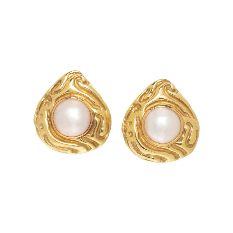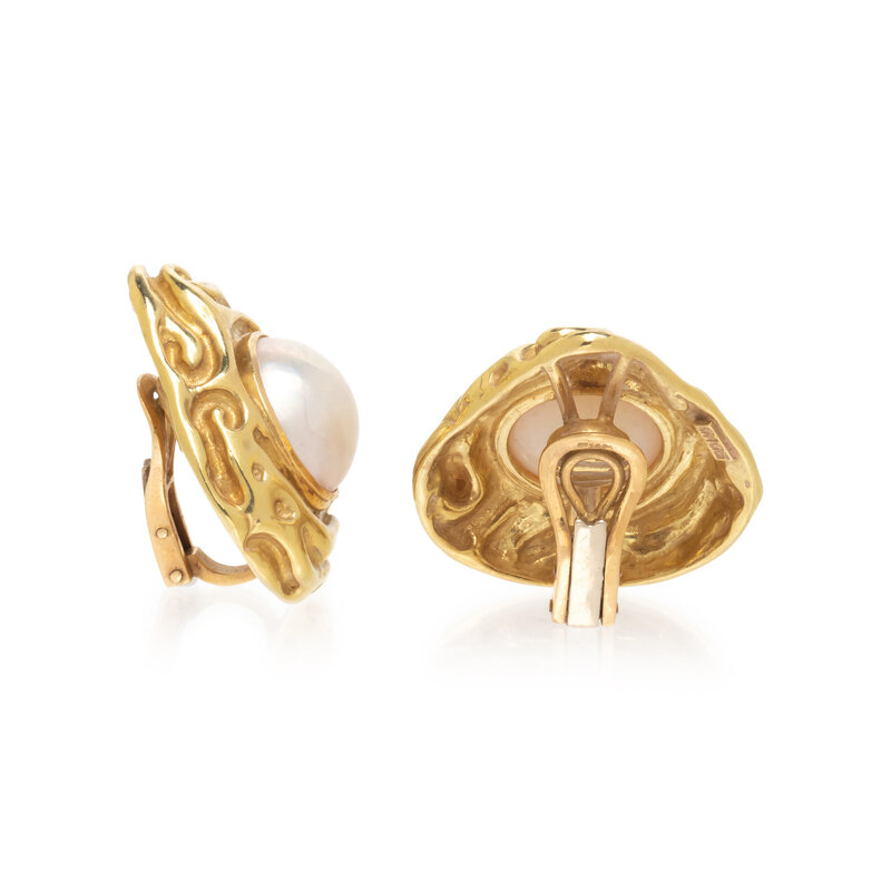 ELIZABETH GAGE, YELLOW GOLD AND MABÉ PEARL CLIP EARRINGS