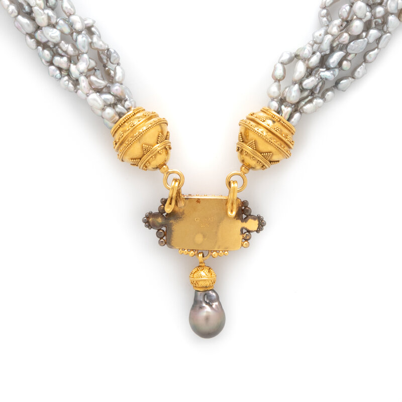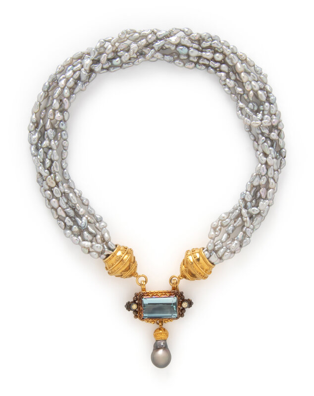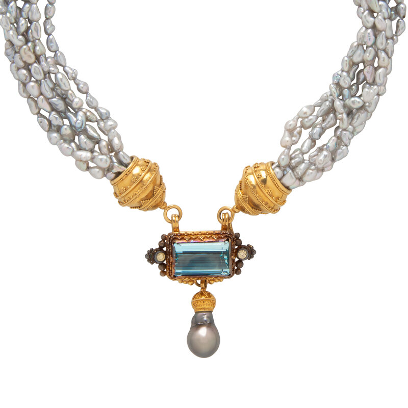 LUNA FELIX GOLDSMITH, YELLOW GOLD, GRAY CULTURED PEARL, AND AQUAMARINE NECKLACE