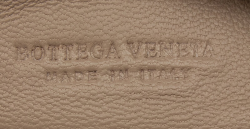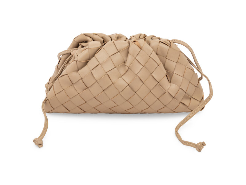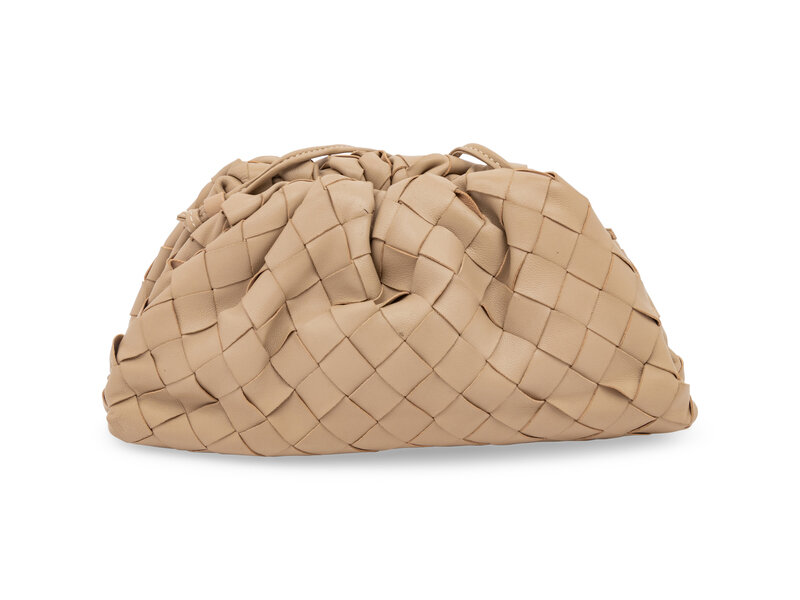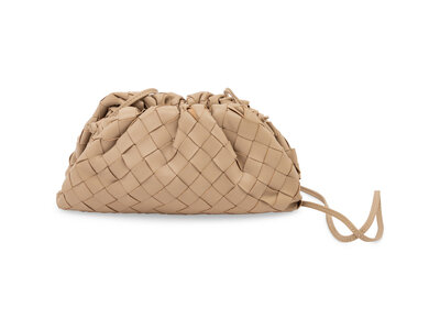 The Mini Pouch Clutch Bag in Taupe Intrecciato Leather with Gold-Tone Hardware.