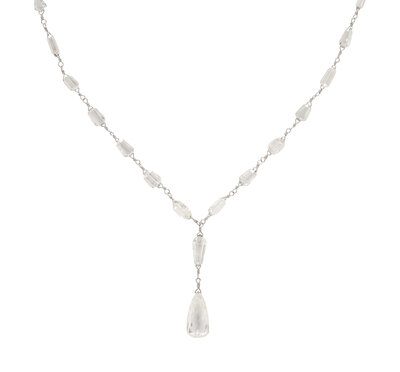 Briolette, rose cut, and bullet shape diamonds weighing approximately 18.00 carats total. White gold and platinum. Necklace: 18 3/8 inches long. Earrings: 1 1/8 inches long.