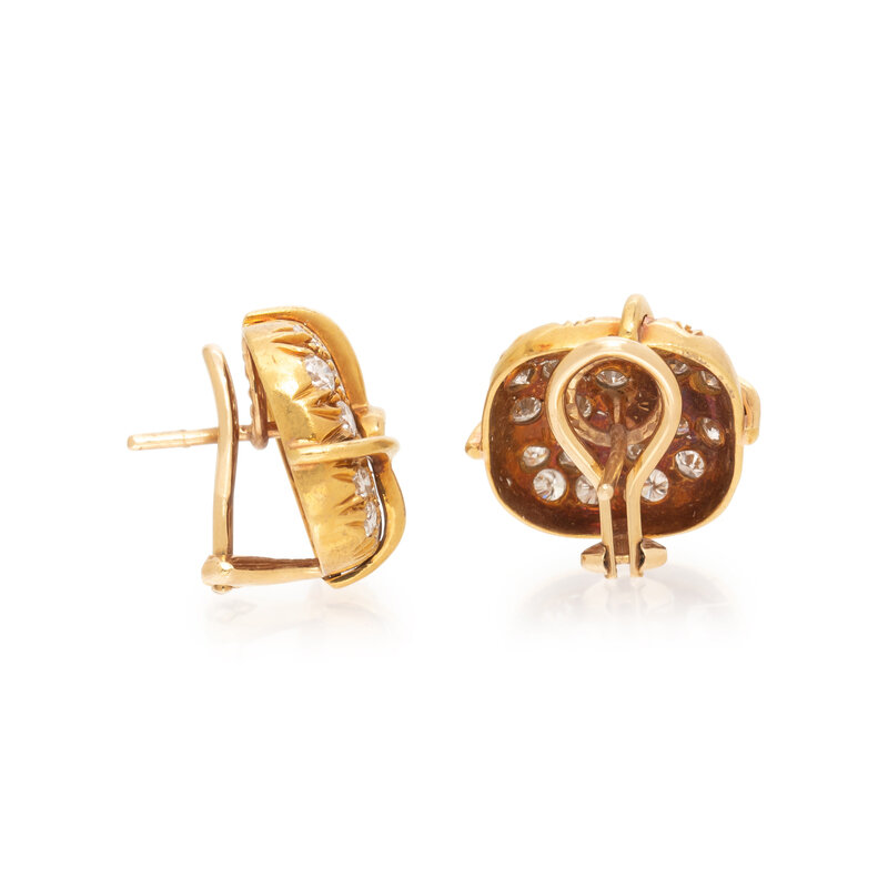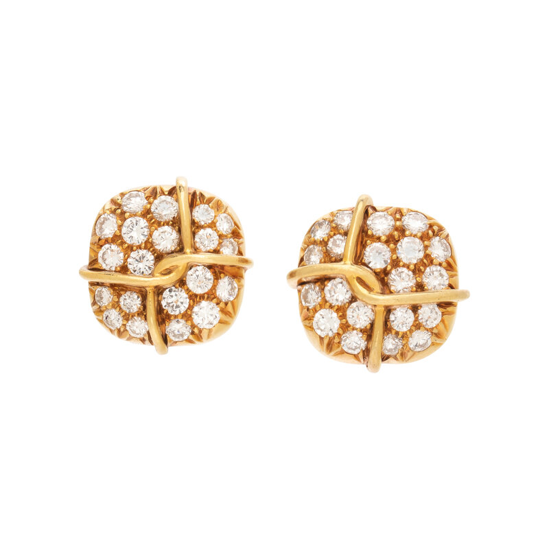 Round diamonds weighing approximately 1.15 carats total. Yellow gold. 3/4 inch long.