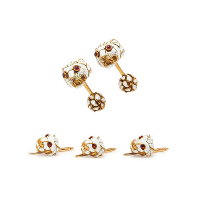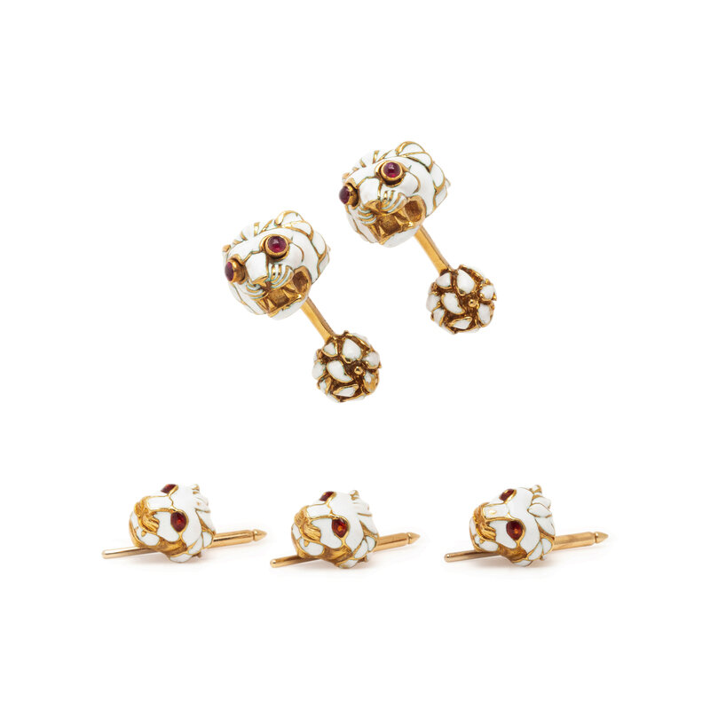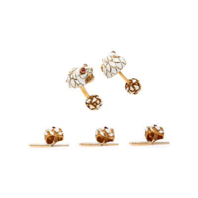 Cabochon ruby eyes and white enamel. 18 karat yellow gold. Cufflinks: 1 1/4 inches long. Studs: 1 inch long.