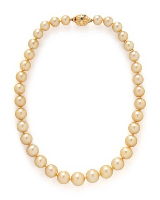 Graduating golden cultured pearls (origin of color not tested) measuring approximately 10.00 - 14.00 mm with a 14 karat yellow gold clasp. 18 1/4 inches long.